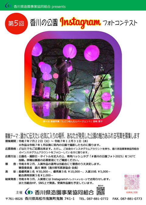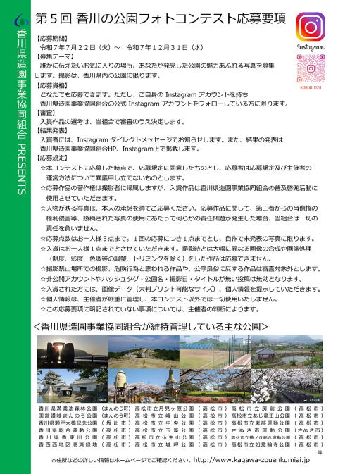 | 締切が迫ってきました! 香川の公園Instagramフォトコンテスト2025 あなたが発見した公園の魅力あふれる写真を募集します。ハッシュタグは #香川の公園フォト2025 詳細はチラシにてご確認ください。 ご応募お待ちしています! |
