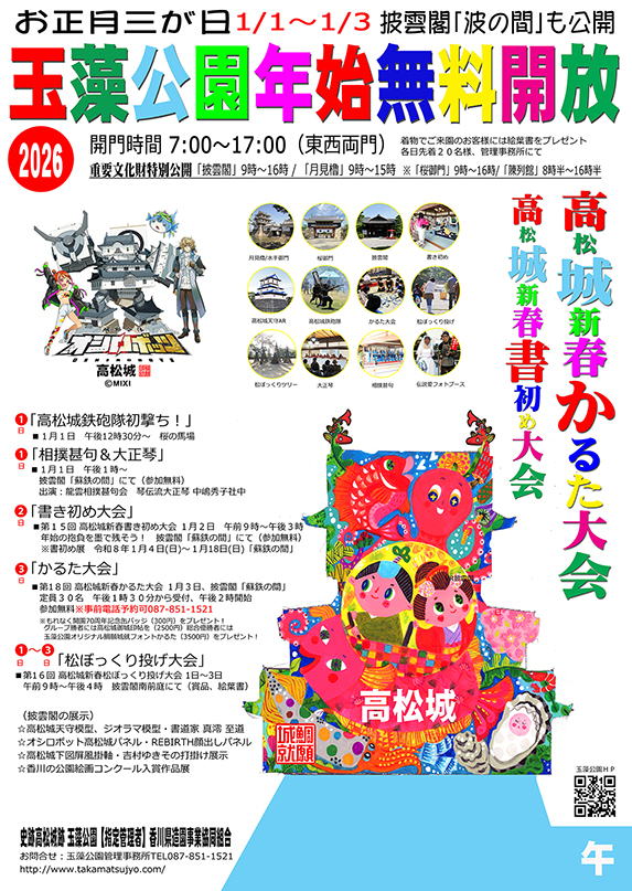高松城鉄砲隊演武 撃ち納め! 日時:12月28日(日)10時30分~ 場所:桜の馬場 内容:火縄銃の実演と記念撮影 主催:玉藻公園管理事務所 |