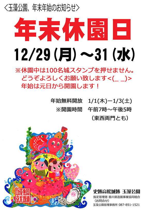 | 年末年始のお知らせ 年末休園 12月29日~ 31日 年始無料開放 1月 1日~ 3日 | |