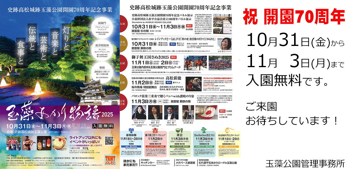 ★ようこそ玉藻公園公式WEBサイトへ! このページは玉藻公園指定管理者≪香川県造園事業協同組合・玉藻公園管理事務所≫が管理しています。20191221