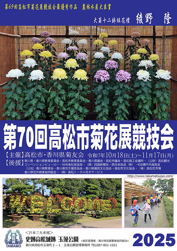 第70回高松市菊花展競技会 日時:令和7年10月18日(土)~11月17日(月) 場所:二ノ丸~三の丸 主催:高松市・香川県菊友会 後援:香川県・香川県教育委員会 高松市教育委員会・香川県議会 高松市議会・高松商工会議所 (公財)高松観光 コンベンションビューロー NHK高松放送局・(株)四国新聞社 西日本放送(株)・KSB瀬戸内海放送 (公社)香川県教育会・香川県花き園芸協会 香川県園芸文化協会・高松市文化協会 (株)高松花市場 香川県花卉商業協同組合 (株)高松トータル花きサービス 問合せ:087-851-1521 |