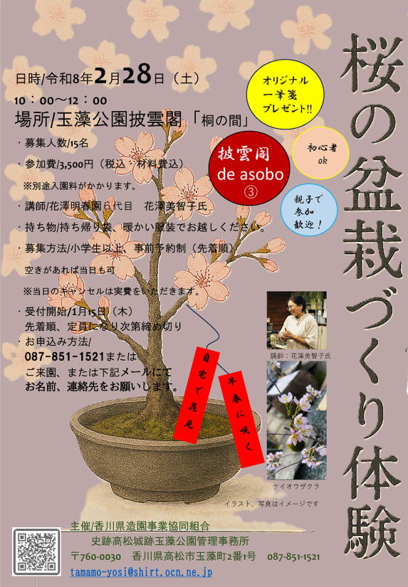 披雲閣 de asobo シリーズ第3弾 「桜の盆栽づくり体験」 先着15名様(残席僅か) 日時:令和8年2月28日(土) 場所:披雲閣「桐の間」 料金:3,500円(入園料別) ※高松城オリジナル一筆箋プレゼント 講師:花澤美智子氏(花澤明春園6代目) 内容:ケイオウザクラを使った盆栽づくりで春を先取り! 主催:玉藻公園管理事務所 お申し込み方法 お電話:087-851-1521 |