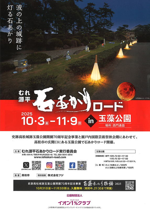 むれ源平石あかりロードin玉藻公園 期間:10月3日(金)~11月9日(日) (あかりが灯るのは10月31日から11月3日の4日間) 場所:西門入ってすぐの通路 玉藻公園開園時間 西門 (10月)6時~17時30分 (11月)6時30分~17時 東門 8時30分~17時 期間中、10月31日~11月3日の4日間は 閉門時間を21時30分に延長します。 主催:むれ源平石あかりロード実行委員会 お問合せ:080-8641-0810 https://www.ishiakari-road.com/ |