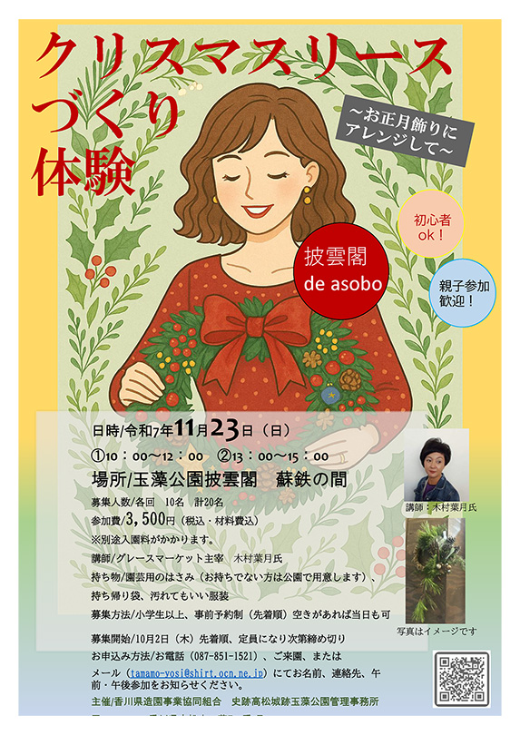 披雲閣 de asobo 『クリスマスリースづくり体験』 日時:令和7年11月23日(日) 場所:披雲閣「蘇鉄の間」 料金:3,500円(税込み・材料費別) 別途入園料大人200円 主催:史跡高松城跡 玉藻公園 (指定管理者:香川県造園事業協同組合) 問合せ:087-851-1521 |