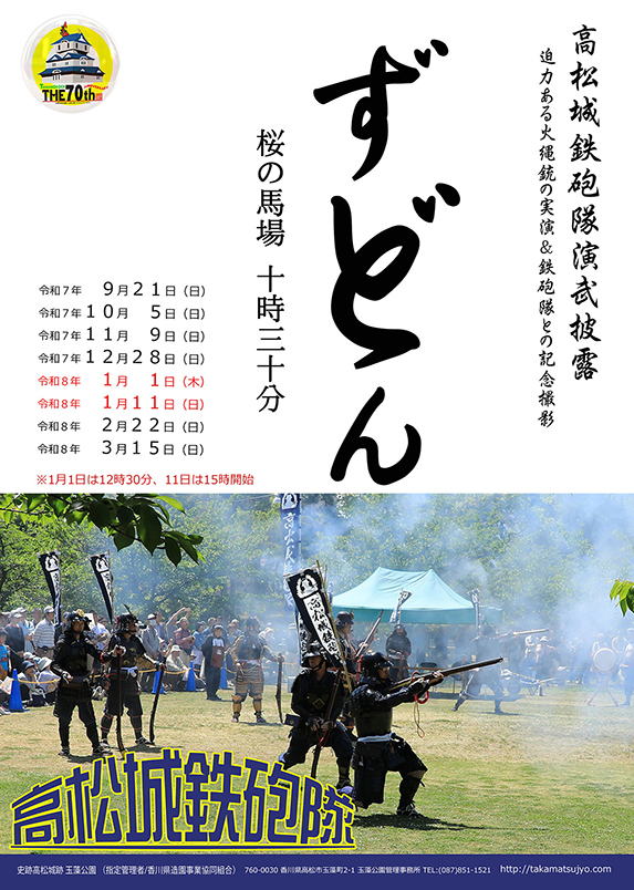 高松城鉄砲隊演武 日時:2月22日(日)10時30分 場所:桜の馬場 内容:火縄銃の実演と記念撮影 主催:玉藻公園管理事務所 |