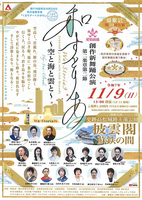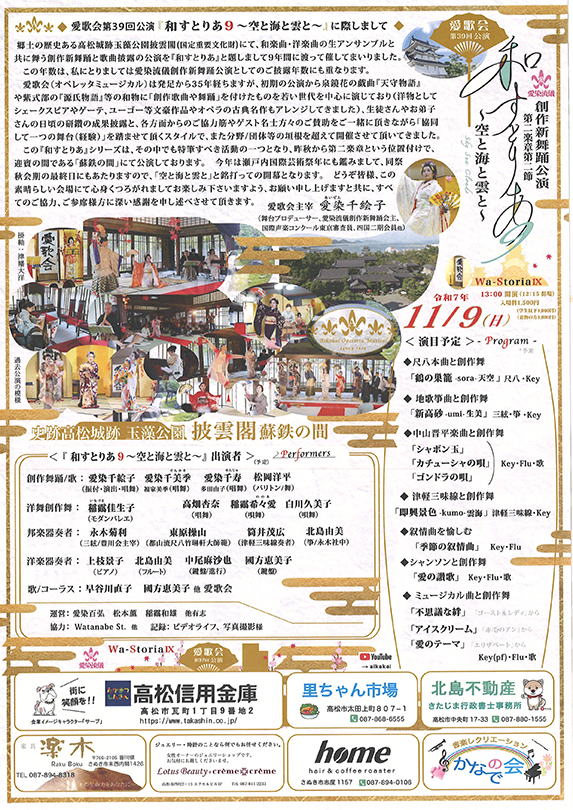 和すとりあ 日時:令和7年11月9日(日) 開場:12時15分 開演:13時 料金:1500円(入園料別) 場所:蘇鉄の間 主催:愛歌会 後援:高松市・朝日新聞高松総局・産経新聞高松支局 山陽新聞社・(株)四国新聞社・毎日新聞高松 支局・読売新聞高松総局・OHK岡山放送 RSK山陽放送・西日本放送(株)・KSB瀬戸内 海放送・TSCテレビせとうち・KBN香川テレビ 放送網株式会社・CMSケーブルメディア四国 CVC中賛テレビ・MCB三豊ケーブルテレビ FM香川・FM815・高松リビング新聞社・ナイス タウン 問合せ・予約:愛歌会09076230140 |